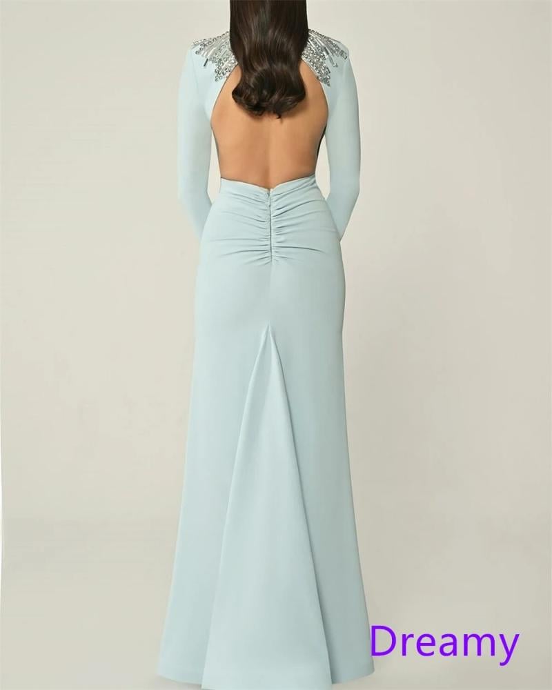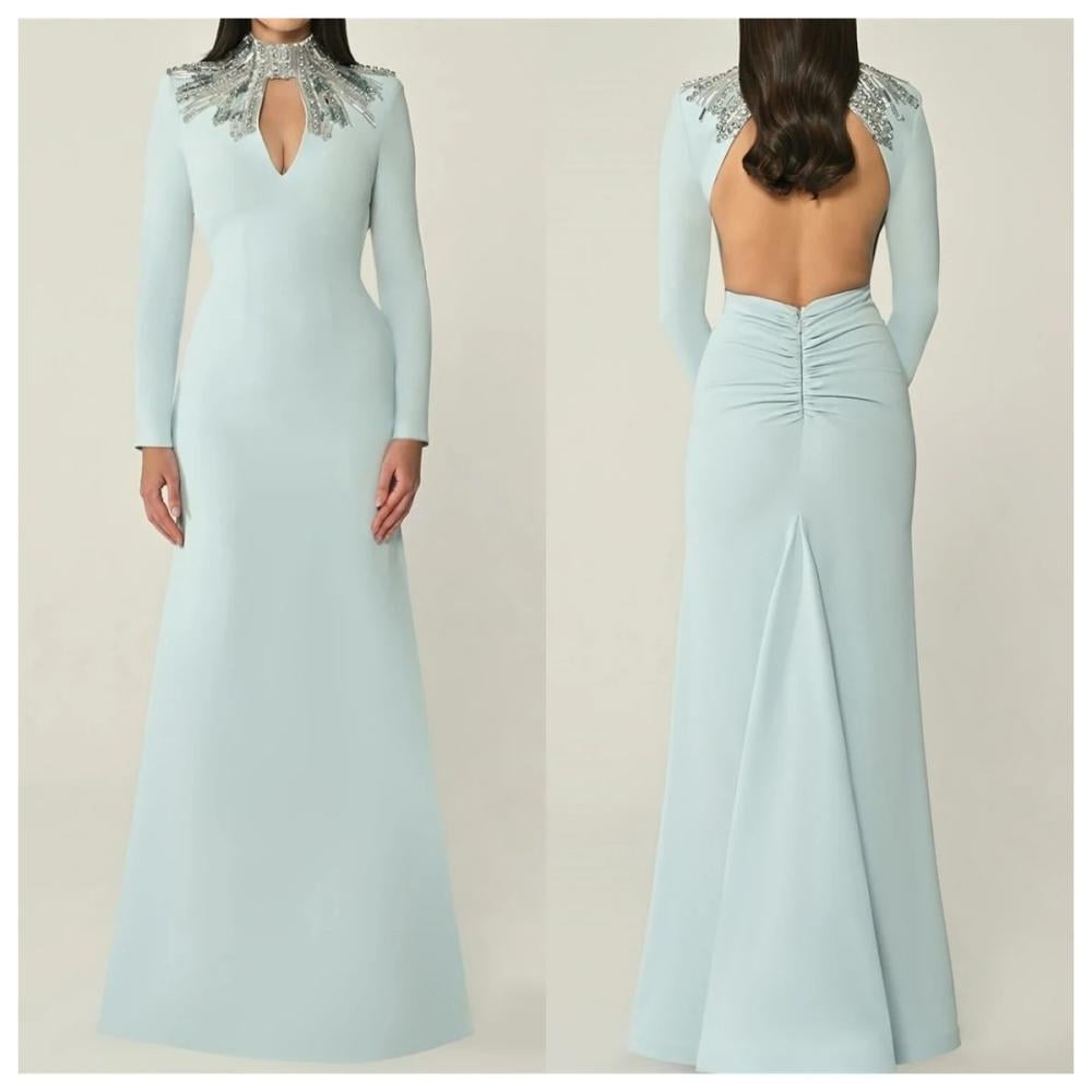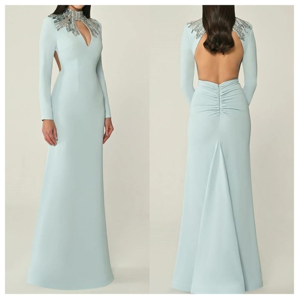 فستان جيرسيه أزرق سهرة فاخر بتصميم مخصص يجمع بين الرقي والجرأة، بياقة عالية وأكمام طويلة مع فتحة صدر وظهر مكشوف ، يناسب السهرات الراقية ويمنحك حضورًا أنثويًا ملفتًا بكل التفاصيل