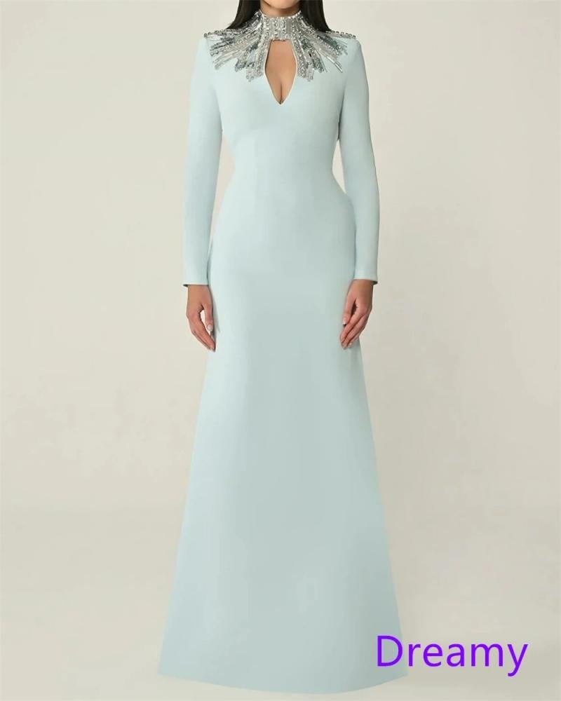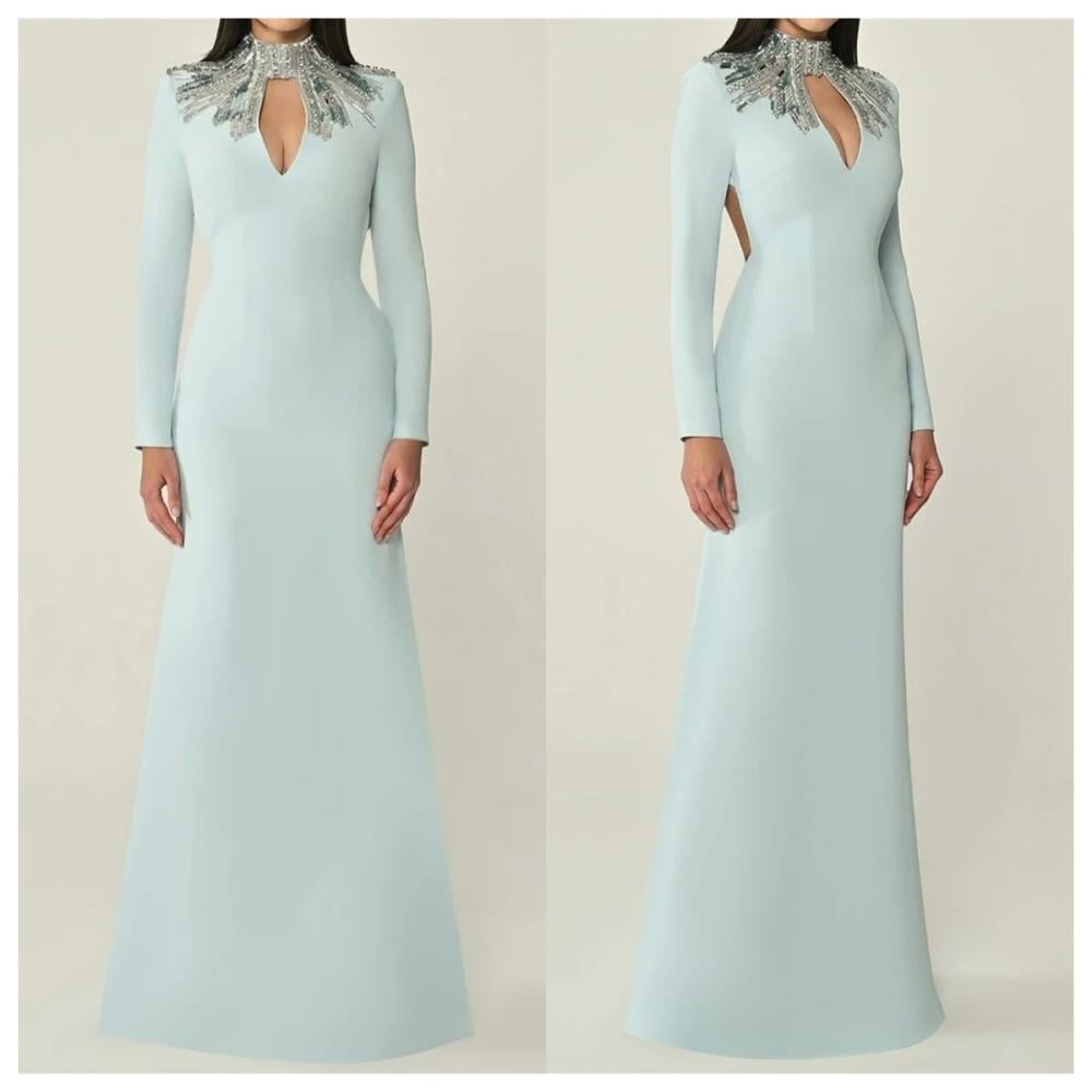 فستان سهرة فاخر من الجيرسيه الأزرق مخصص بياقة عالية وأكمام طويلة