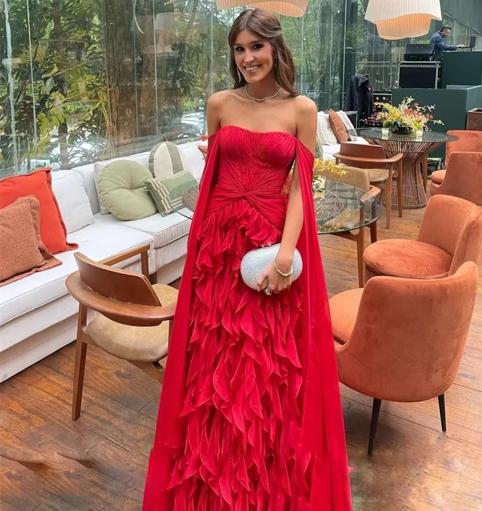 فستان سهرة أحمر بدون أكتاف وكشكشة متدرجة
